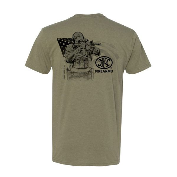 Featuring the iconic FN Firearms logo on the front chest and a bold back graphic of an armed tactical operator with an American flag backdrop, this tee represents strength, precision, and American craftsmanship.
